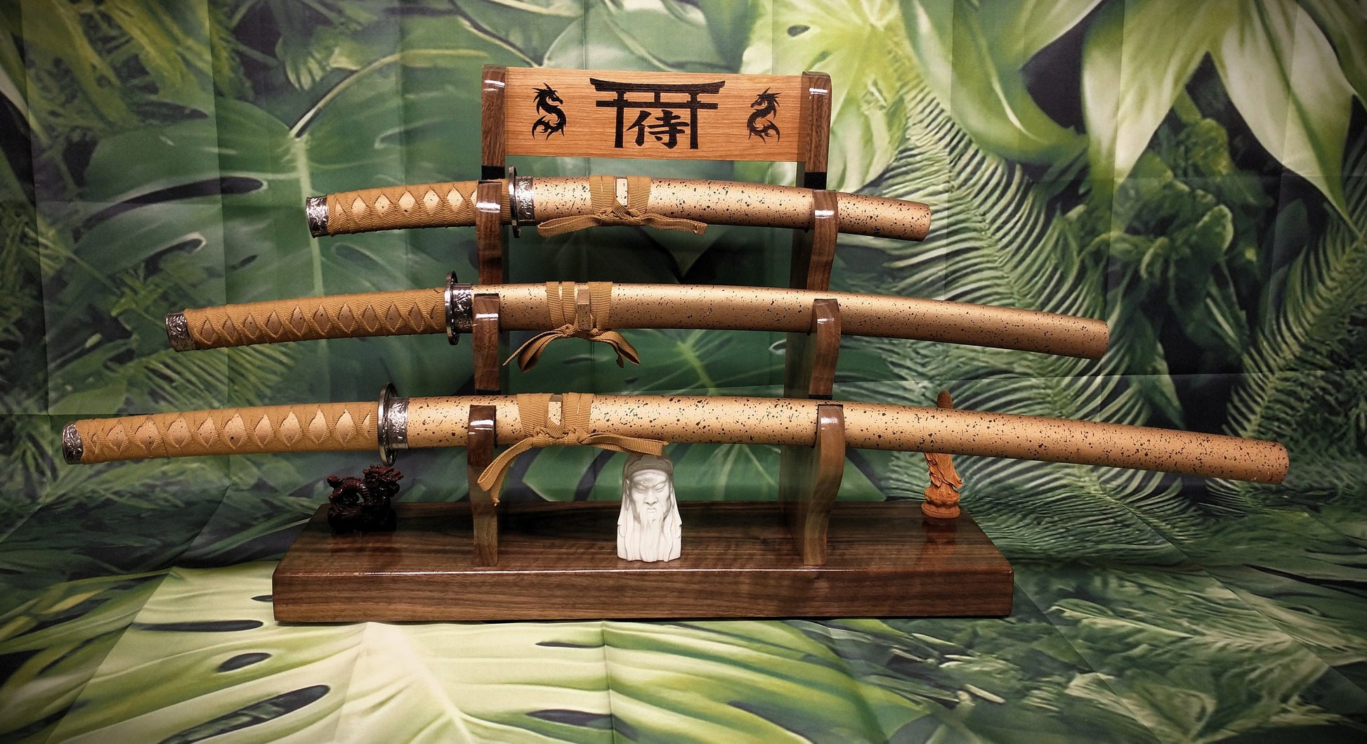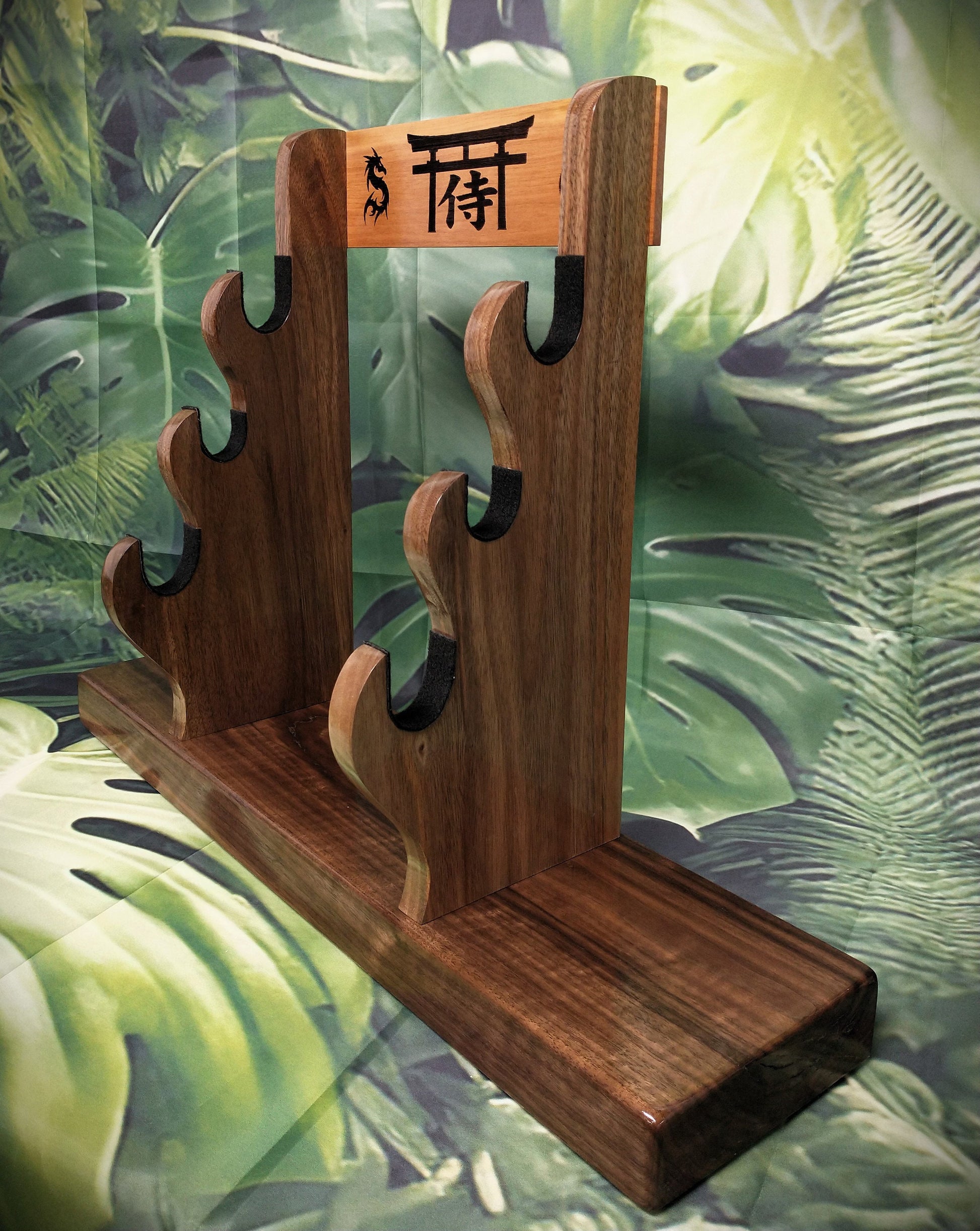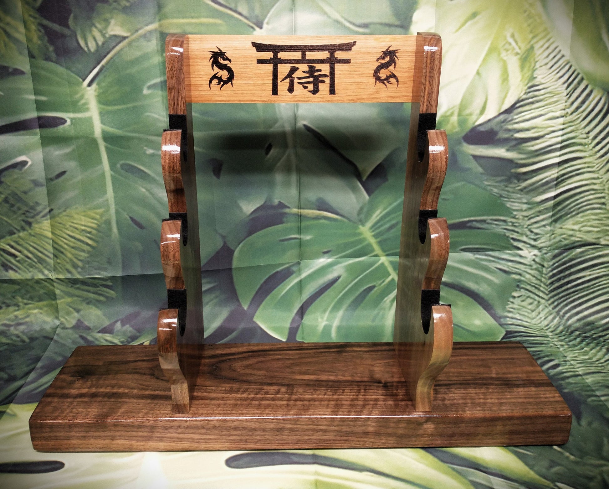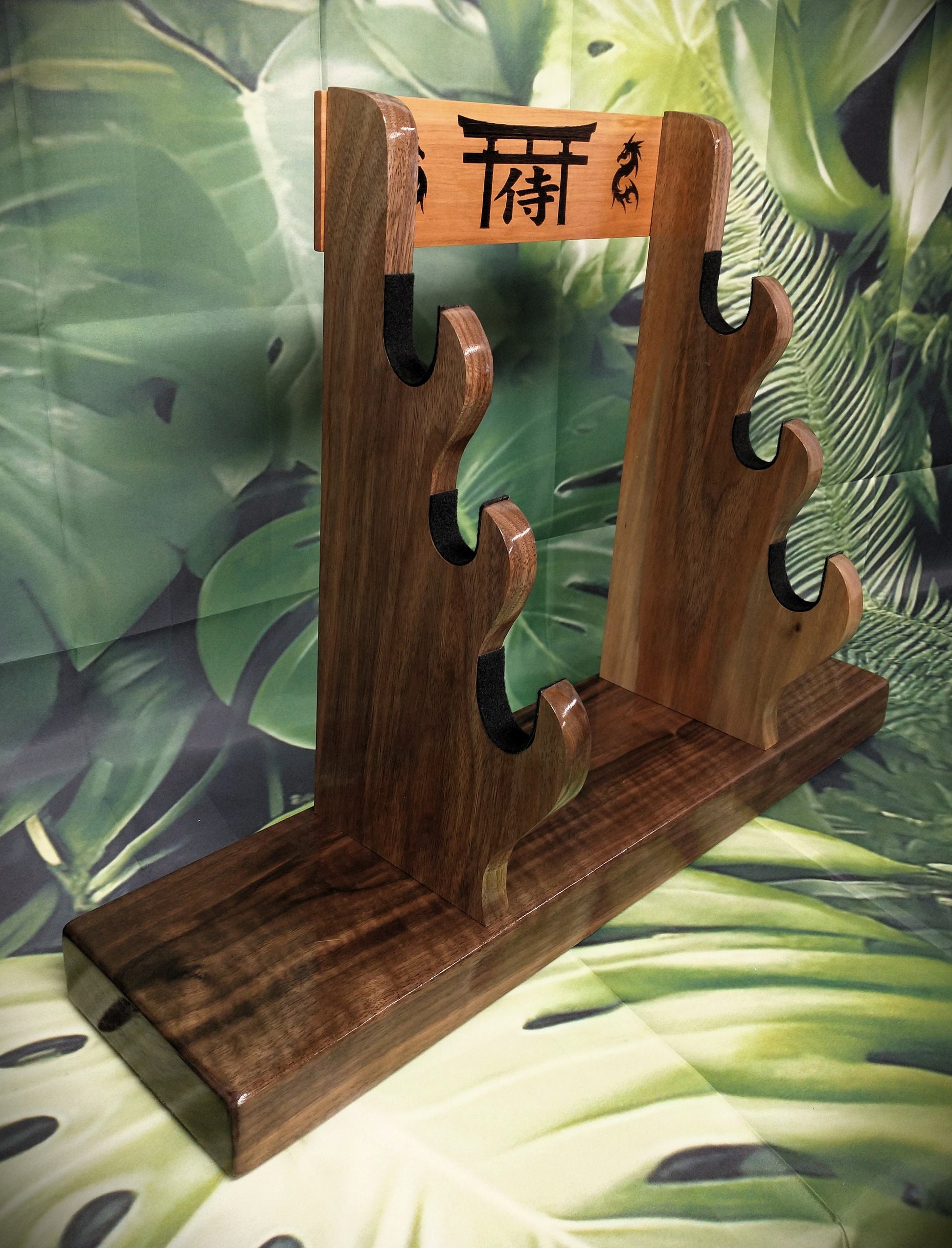 Tradition 3 Tier Beautiful Dark Flame Walnut Japanese Samurai Sword Display Stand Collectors Gift