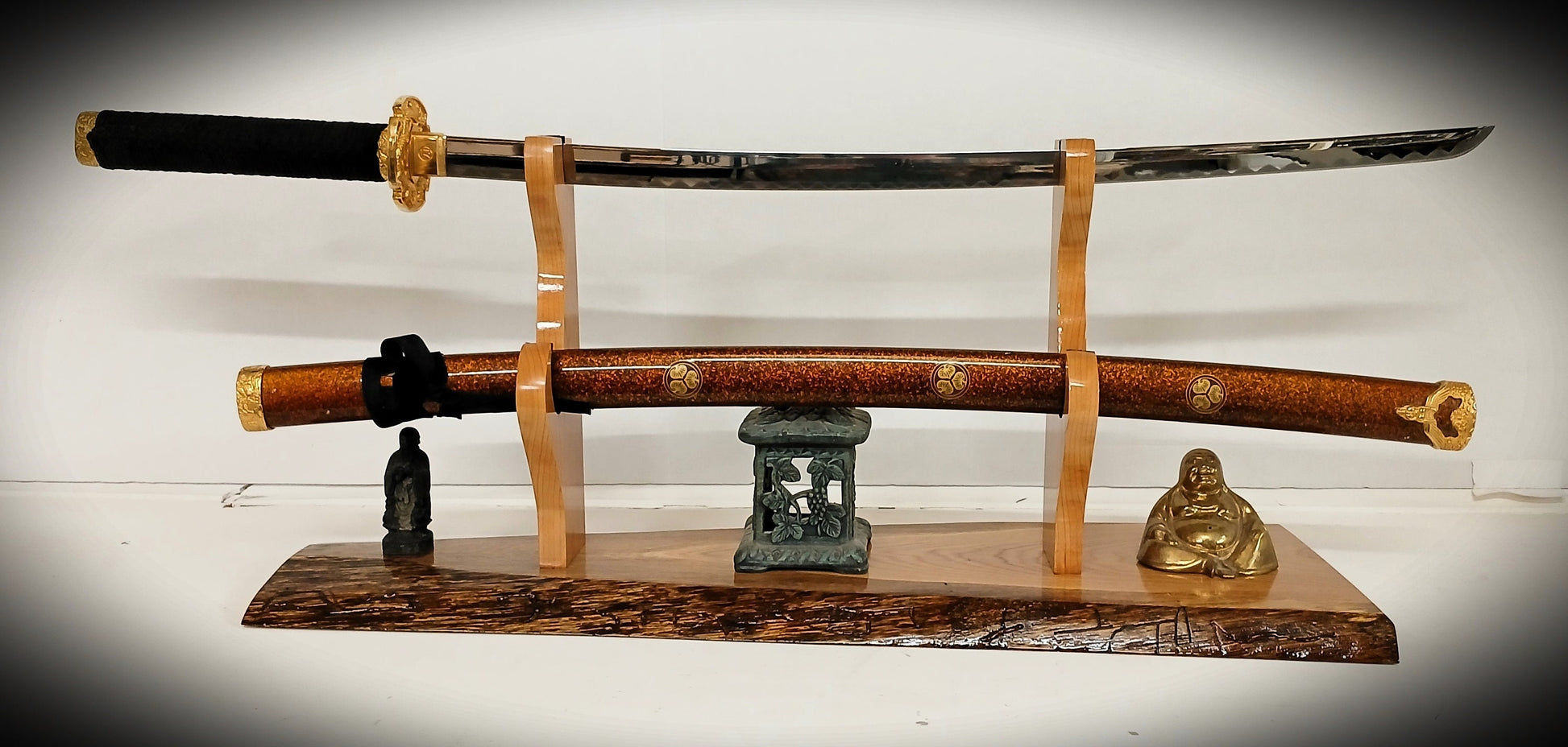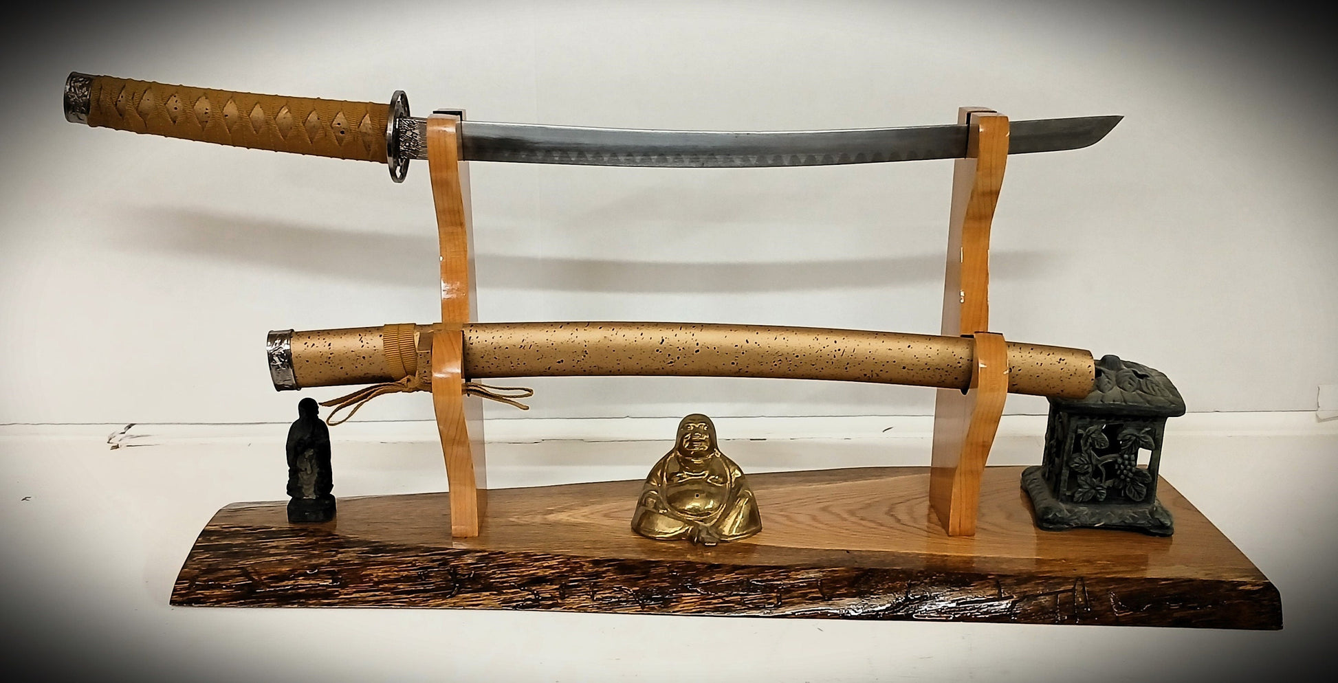 Vintage Sword Display Stand Rustic Live Edge Oak Military Saber Katana Long Sword Blade and Sheath Unique Gift, FREE SHIPPING